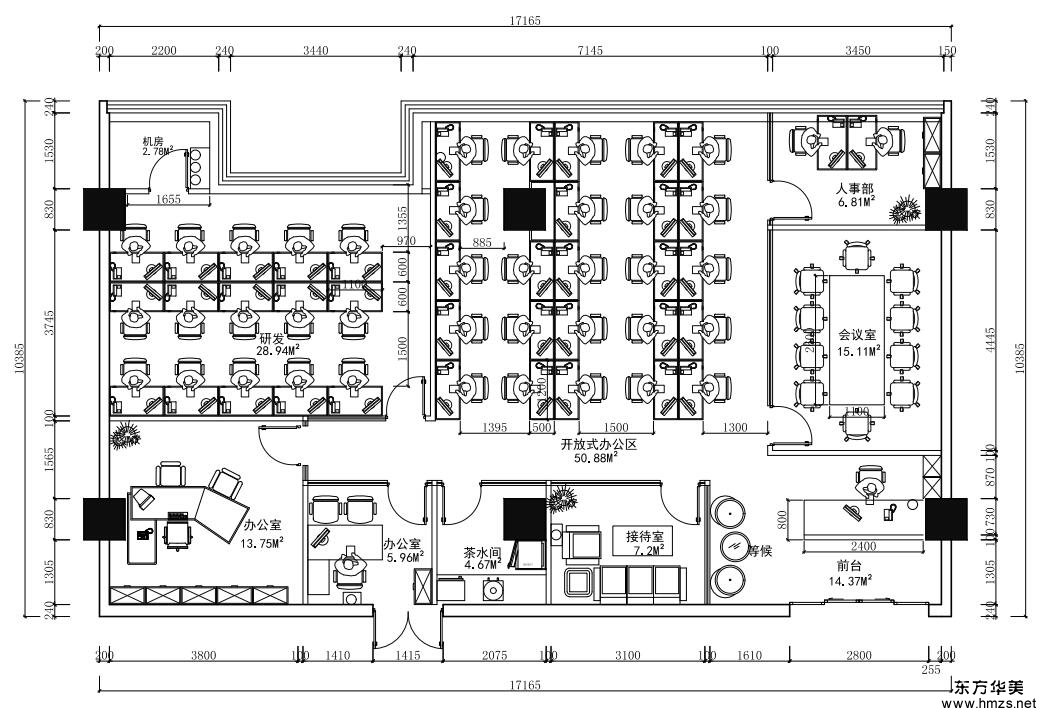 ▄原建筑結(jié)構(gòu)分析: 總經(jīng)理辦公室、財(cái)務(wù)室和一些特別的會議室外,建議采用全通透或者半通透的隔斷,這樣可以增加企業(yè)融合力和方便交流,也便于員工互相監(jiān)督。在裝修設(shè)計(jì)中要突出重點(diǎn)區(qū)域,抓住幾個關(guān)鍵點(diǎn),例如前臺、會議室、總經(jīng)理辦公室等空間。要盡可能少地采取大的裝修結(jié)構(gòu)和造型,多用燈光和色彩以及現(xiàn)代化的配飾組合取得良好的裝飾效果。